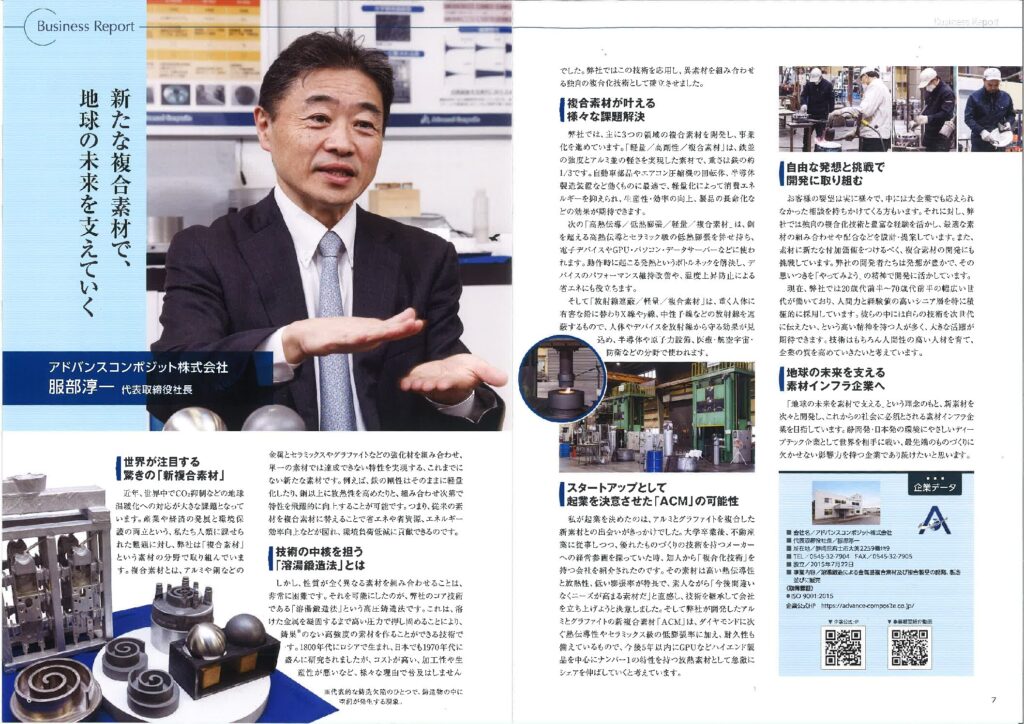 誌面では、当社が開発する新たな複合素材や、ものづくりの中核技術である「溶湯鍛造法」をはじめ、放熱・軽量・低熱膨張といった特性を活かした課題解決の考え方、そして「地球の未来を支える素材インフラ企業へ」という今後の展望について掲載いただいております。
